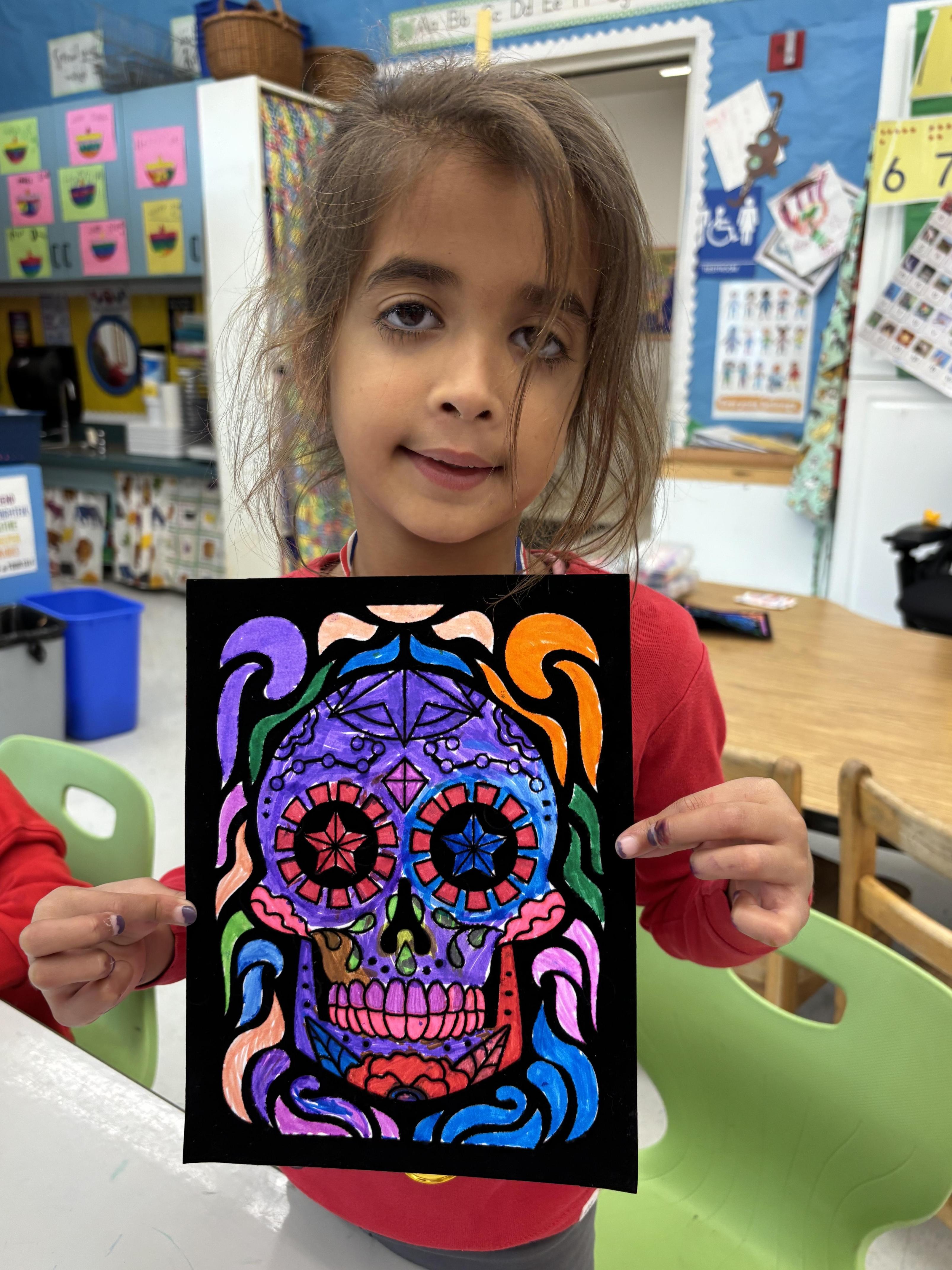 We read about the Mexican celebration, Day of the Dead, this week. We learned that this is a celebration of life and a time for families to remember and celebrate loved ones that have passed on. We read many books that described special foods, decorations and customs that might be found during Day of the Dead. We even made our own colorful skull!